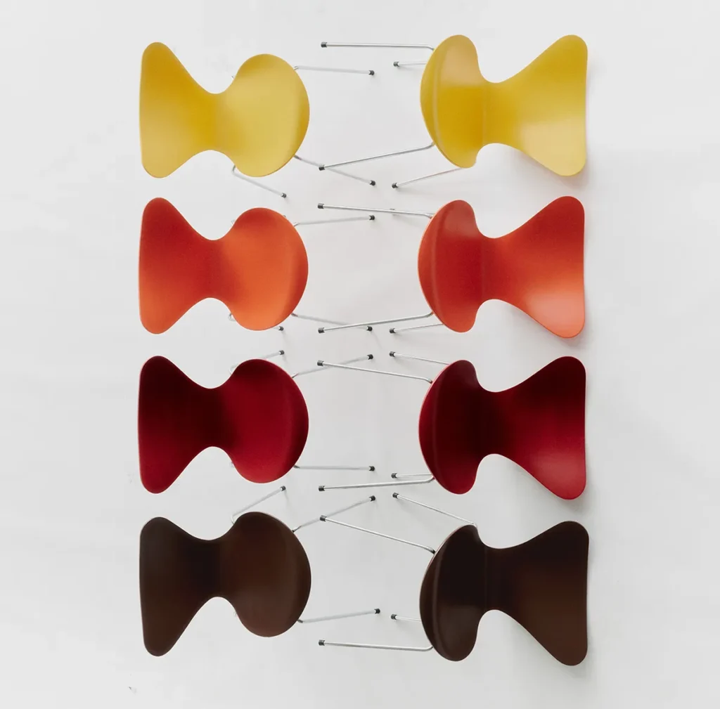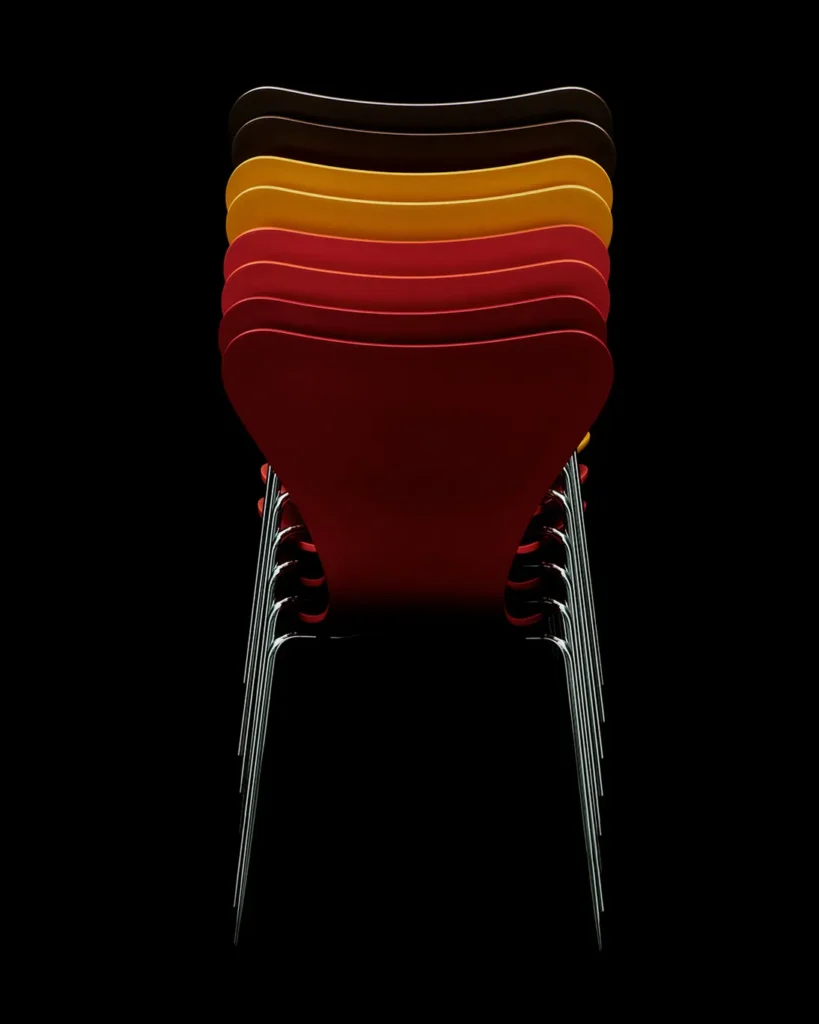今回採用されたカラーは、イエロー、オレンジ、レッド、ブラウンの4色です。これらは1972年にフリッツ・ハンセンの創業100周年を祝うためにパントンが提案した色をもとに再構成されたもので、彼の色彩理論「PAN-COLOURS」に基づいています。ミニマルな造形のセブンチェアに鮮やかな暖色系の色彩を重ねることで、北欧モダンの静かな造形とポップなエネルギーが共存するデザインが生まれています。