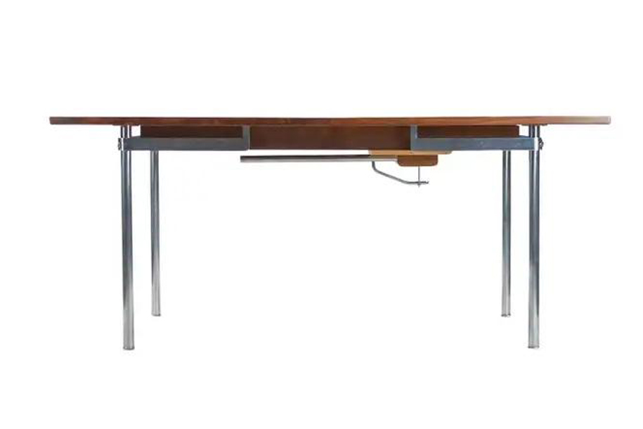 特徴的なのは、拡張機能を備えた大規模なテーブルトップです。チーク材やローズウッドを用いた天板は、クロムメッキスチール製の脚部に支えられ、まるで浮遊しているかのような印象を与えます。この合理的な構造は、安定性と優雅さを両立させ、あらゆる生活空間に調和する存在感を発揮しています。
