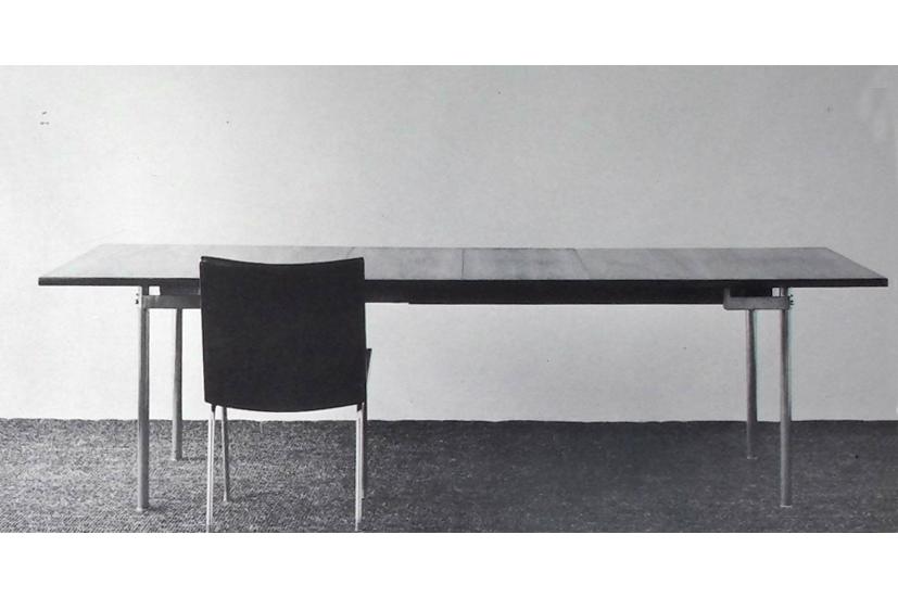 天板はチークまたはローズウッド突板で仕上げられ、伸長機構を備えることで日常から来客時まで柔軟に対応できる実用性を持ちます。脚部は細身のスチールで構成され、天板を視覚的に浮遊させるような軽やかな印象を生み出しています。合理的で無駄のない構造とともに、ウェグナーが追求した「隠れた構造美」が明確に示されています。