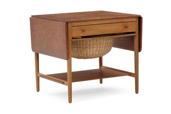 特徴的なのは、両側に折りたためるドロップリーフ式の天板、多区画の引き出し、籐製の引き出し式バスケット、そして下部の棚板という、複数の機能を巧みに統合した構造です。これらは単なる利便性の追求ではなく、使用者の生活動線を自然に導く「機能美」として計算されており、日常の作業を効率的かつ優雅に支えるための工夫が随所に見られます。