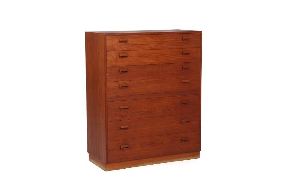 本作は、モーエンセンが一貫して掲げた「日常のための道具」という思想を体現した収納家具です。視覚的な静けさと秩序を最優先し、前面はフラットな面構成と一体型のハンドルによってまとめられています。人の生活動線に無理を強いない直線基調のプロポーションは、限られた居住空間にも素直に収まり、必要十分な容量を確保するという明確な目的に奉仕します。