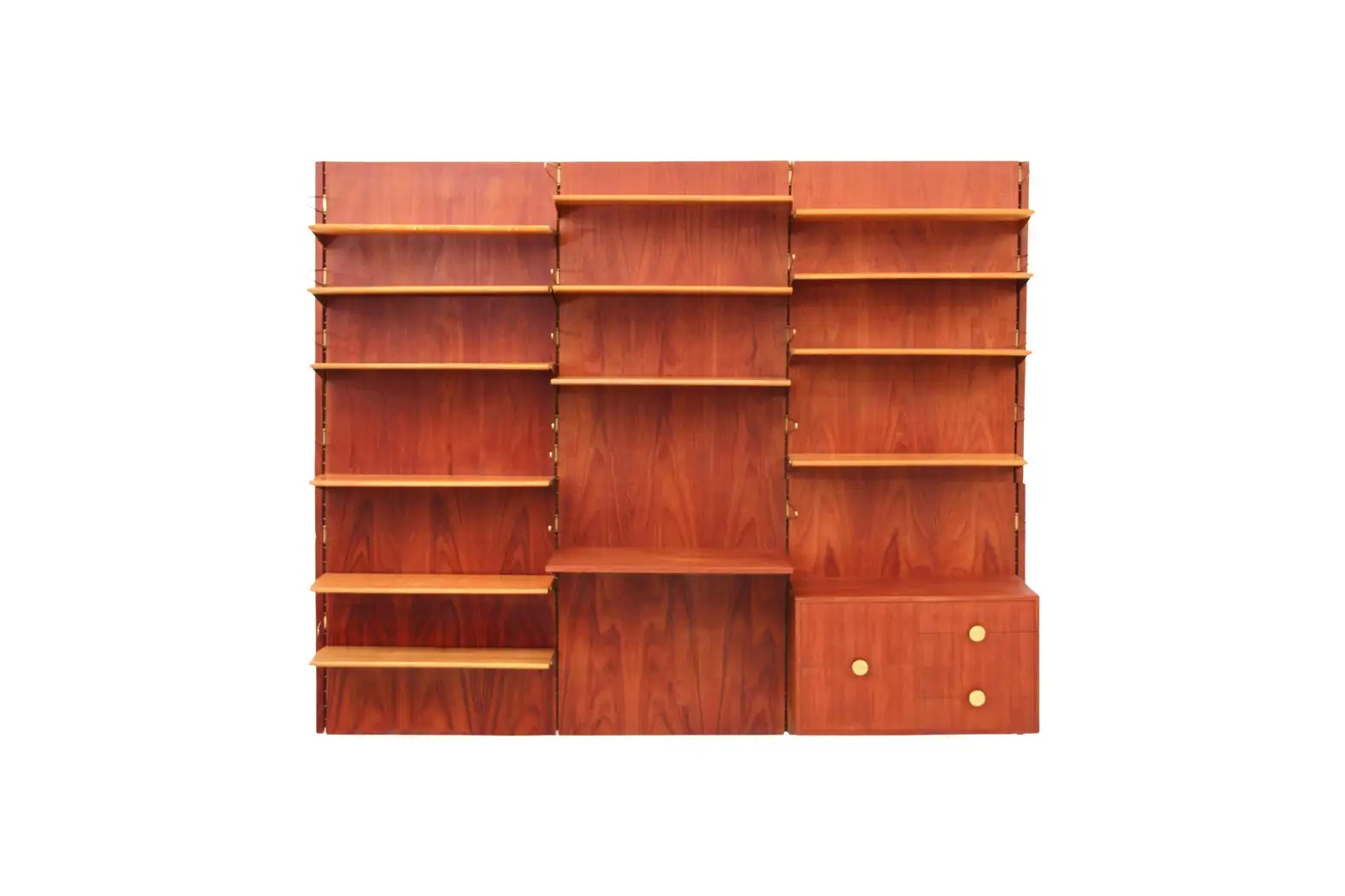 構造面では、棚板を自在に調整できるメモリ付きの支柱と、真鍮金具による精密な固定機構が特徴です。これにより、使用者は収納や展示の目的に応じてユニットを再構成することができました。さらに、当時として革新的だったノックダウン構造(分解・組立可能構造)を採用し、輸出や大量生産に対応した点も特筆されます。この技術は、デンマーク家具が世界市場に進出する契機となった要素の一つでした。