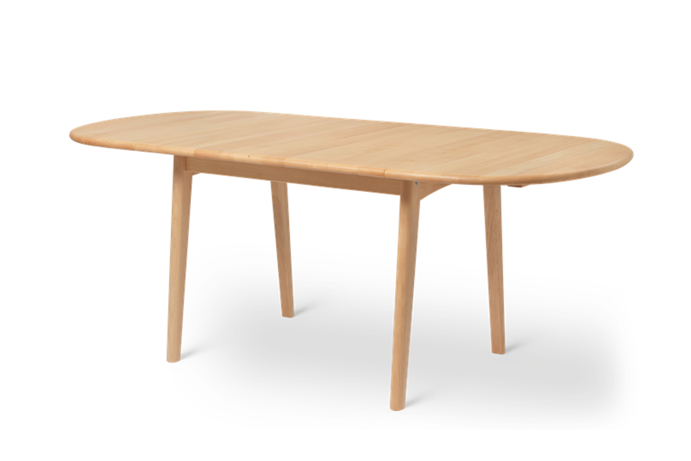 正方形のコンパクトな姿から、伸長板を用いることで最大6人まで対応できる楕円形へと変化します。この柔軟性は、単に機能的であるだけでなく、場の雰囲気そのものを変える力を持っています。丸みを帯びたエッジは安全性と柔らかさを兼ね備え、テーパー状の脚が軽やかな印象を与えつつ、幕板による堅牢な構造が安定性を保証しています。
