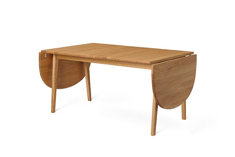 両端に備えられた半円形のドロップリーフにより、人数やシーンに応じてサイズを自在に変化させられるこのテーブルは、都市生活における限られた空間を有効に活用できるよう設計されています。片側だけを折り畳んで壁付けすることも可能で、柔軟なレイアウトを実現する点は他の伸長式テーブルには見られない特徴です。