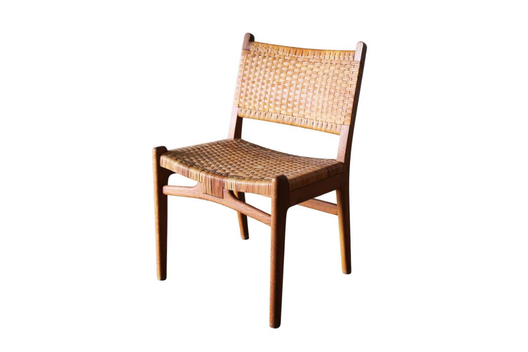 籐は座と背で役割が分けられ、張力設計と目の配列によって機能と表情を両立します。特に背は前後二重張りとする個体があり、局所的な荷重に対する耐久を高めると同時に、背越しの透け感が空間の抜けをつくります。面と線、硬質と柔軟の対置を穏やかに解消するこのテクスチャーの設計は、ウェグナーの有機的機能主義を端的に語ります。