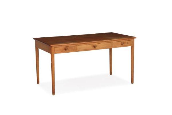 テーブルには3つの引き出しが備わり、そのうちのひとつには鍵が掛けられる仕組みがあり、さらに内部には事務用品を整理できる精巧な仕切りが隠されています。単なる実用的な収納ではなく、日常の細部にまで寄り添うウェグナーの思考が反映されたディテールです。特に彫刻的に造形された取っ手は、このテーブルを象徴するデザイン要素となっています。