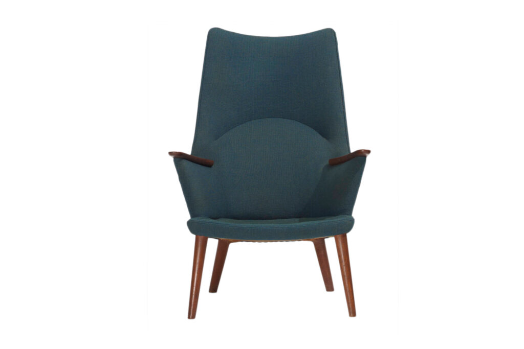Also designed in 1954, the AP28 adds distinctive “wing” extensions to the backrest, creating a more enveloping and protective shape. Like the AP27, it features Wegner’s recognizable wooden “bear paws,” with subtle variations across production. Measuring W860 × D800 × H1080 mm, the AP28 has a more generous scale and a striking sculptural presence. Production numbers were limited, making it significantly rarer and more sought after today.
