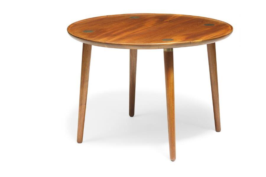 「Fionia」コーヒーテーブルは、デンマークを代表する家具デザイナーであり指物師のヤコブ・ケアによって1939年にデザインされた作品です。円形の天板に施された真鍮の象嵌、立ち上がった縁、そして先細りの丸脚という特徴的な意匠は、ケアの建築的な感覚と英国クラシックへの敬意を背景にしながらも、モダニズムの洗練を取り入れたものです。