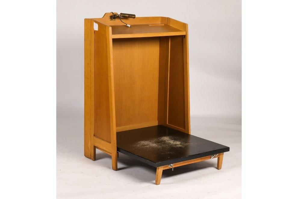 このロストラムは折りたたみ構造を備え、使用しない際には極めて薄い状態で収納できます。公共施設に求められる可変性と合理性に応える一方で、動作の精度や構造の整い方には妥協がなく、ウェグナーが職人出身のデザイナーであることを実感させる設計です。