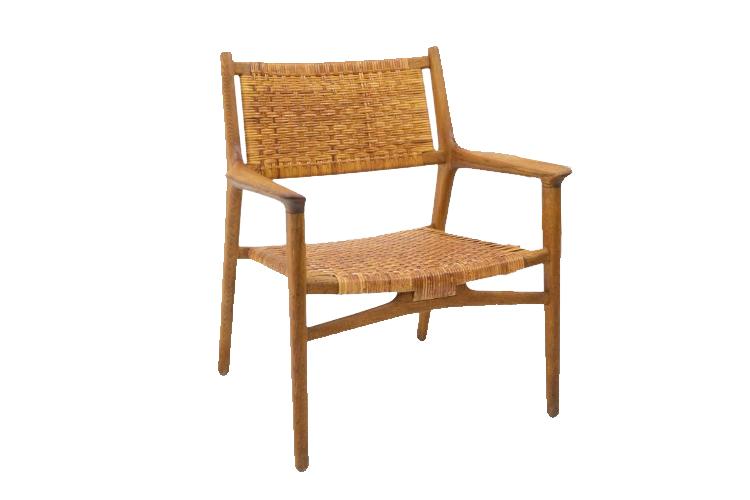デザインの最大の特徴は、滑らかに削り出された有機的な木部のラインと、手編みの籐(ラタン)が織りなす透明感にあります。特にアームから後脚にかけての流れるようなラインは、彫刻的な柔らかさを体現しており、工業製品にはない人間工学的な配慮を感じさせます。籐を使用した座面と背もたれは、通気性と軽やかさを提供すると同時に、堅牢なオークフレームの存在感を柔らげ、空間に圧迫感を与えません。