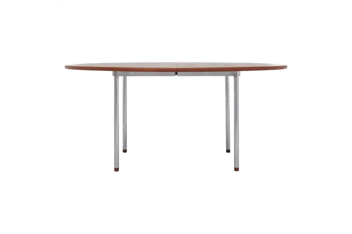 本作の大きな特徴は、チーク材の天板とスチール脚という異素材を組み合わせたハイブリッド構造にあります。ウェグナーは木材を主体とする作品が多い中で、あえてスチールを採用しました。これは単なる意匠ではなく、大径テーブルにおいて着席者の脚周りの空間を最大限に確保し、安定性を損なわないための機能的解決策でした。スチール脚は古艶仕上げが施され、チーク材の深い質感と調和するように意図されています。
