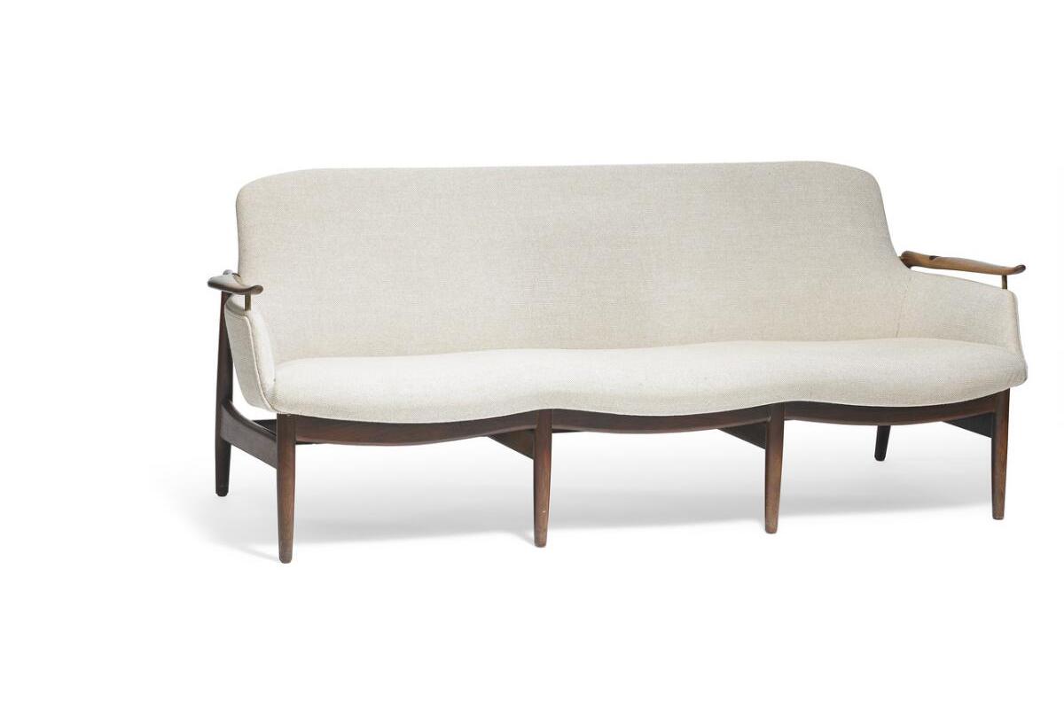 NV53ソファは、フィン・ユールが1953年にデザインし、キャビネットメーカーのニールス・ヴォッダーが製作した三人掛けソファです。ソファ単体としても存在感を放ちますが、三人掛け特有の構造と造形がこの作品の魅力を一層際立たせています。